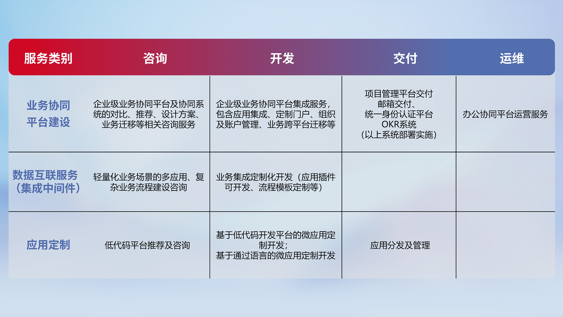 针对钉钉、、、企微、、、、IDaas等平台级产品提供产品的规划、、、方案、、、交付、、、定制化开发等服务,,,实现如统一协同办公、、、、智能客户服务、、、混合会议管理、、智能数据查询、、等业务场景,,实现数字化转型。。。。