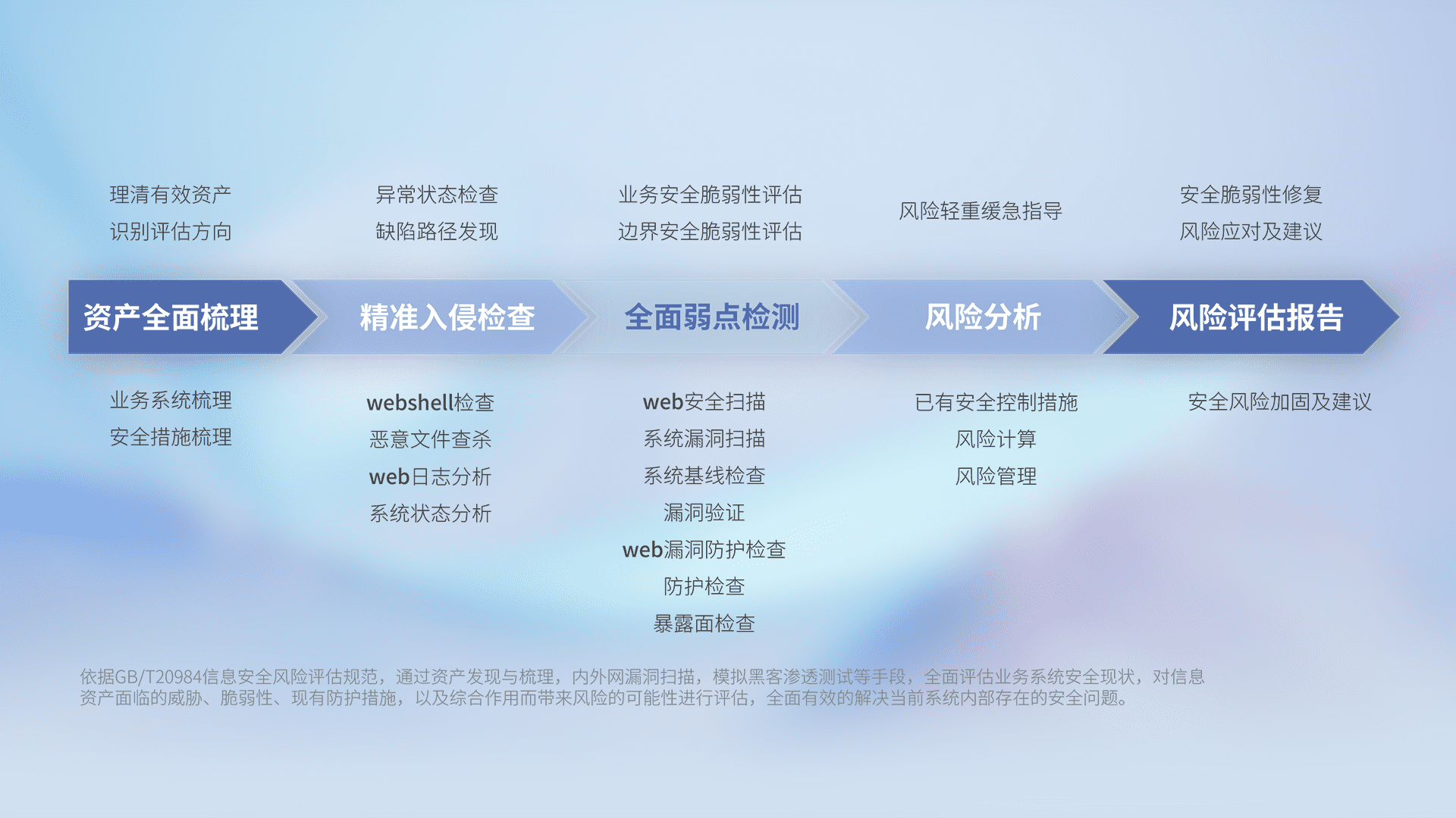 针对客户行业特性,,,,以专业的安全服务+多厂商联合解决方案提供专属的一站式安全管理服务,,,帮助客户全面感知网络空间威胁,,,基于识别、、检测、、、、分析、、、防护、、监测、、、响应的服务理论模型,,,从方案咨询、、、集成交付、、、评估验证、、优化加固、、、运维运营,,,致力于为客户提供完整的闭环管理式安全服务。。。。以实战经验为客户打造高抵御风险的安全体系,,,,帮助客户发现威胁、、对抗威胁、、、处置威胁,,,不断积累安全对抗能力,,持续保障数字化安全。。